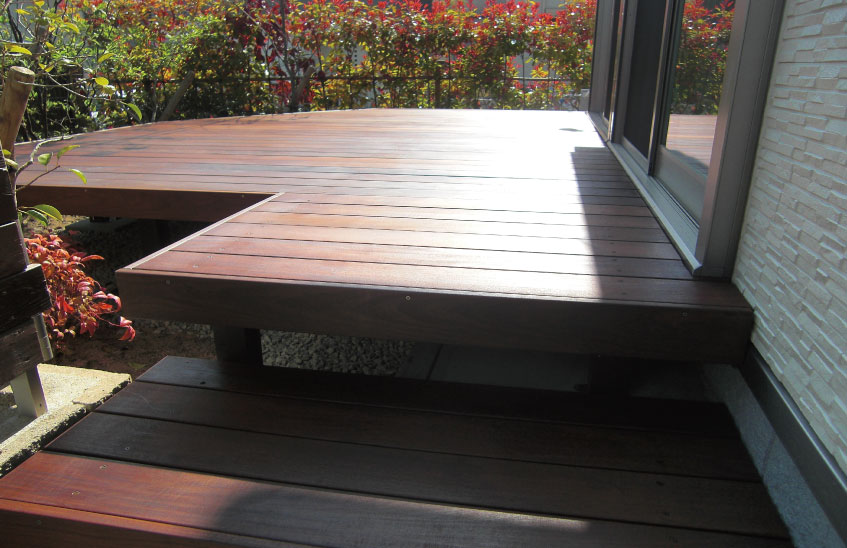 長い年月を通して味わいの出てくるウッドデッキをとのご要望に、今回は土台をLIXIL製のアルミ土台、そして床材にアイアイウッドとも呼ばれるウリンでのウッドデッキをご提案させていただきました。