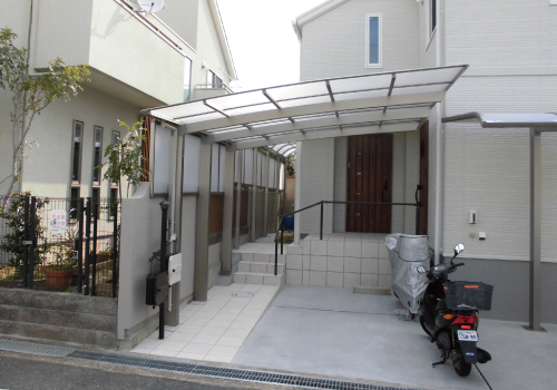 ガレージから玄関、勝手口まで続く屋根は大変便利だと思います。