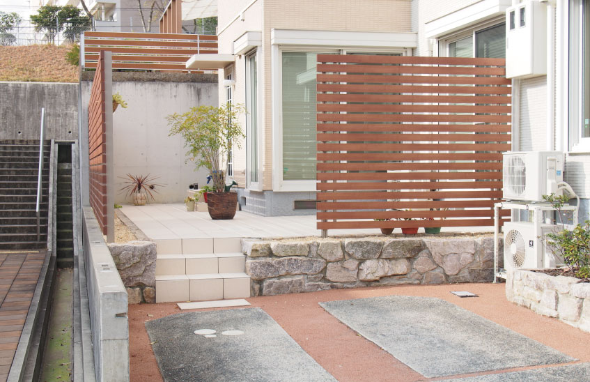 木彫のフェンスと白いタイルで爽やかな庭にリフォーム。